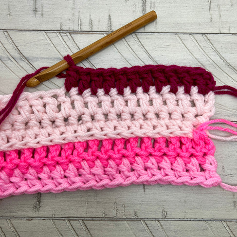 (WS) Row 4: (Pretty In Pink) Turn work over to the WS. Working on top of the last row, ch 2, DC in 3rd loop 120st. Tie off and weave in ends